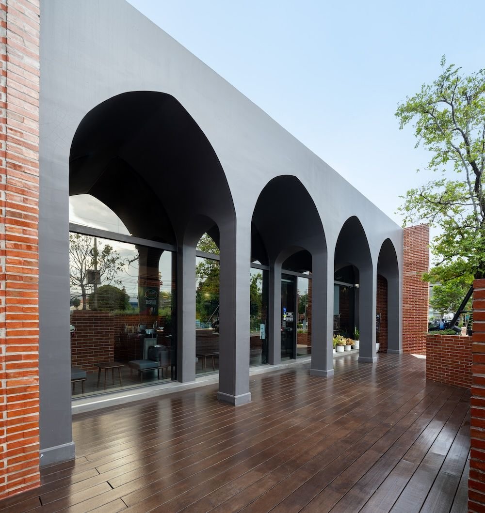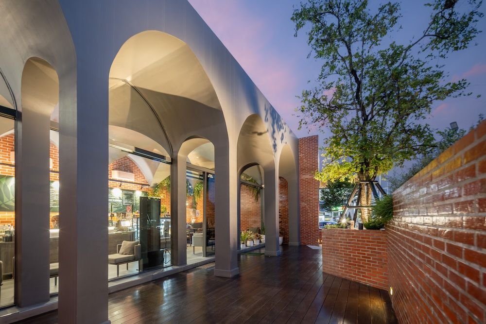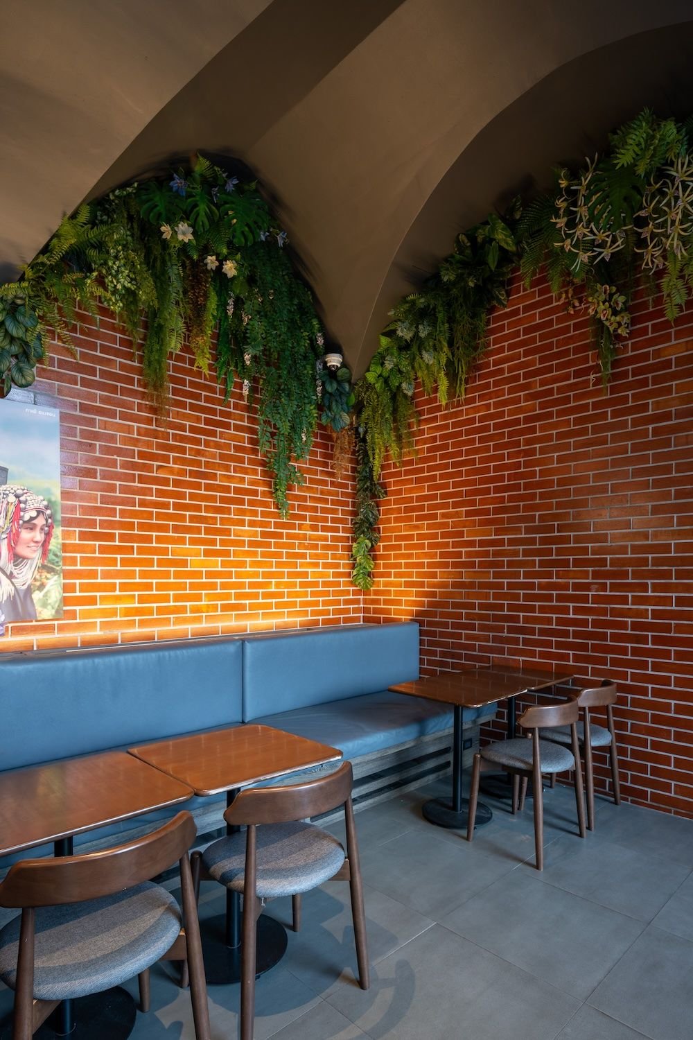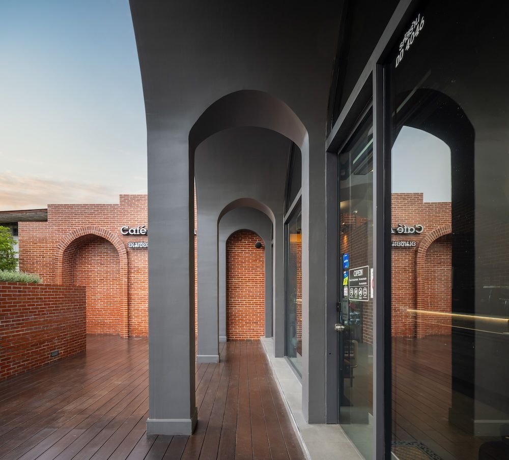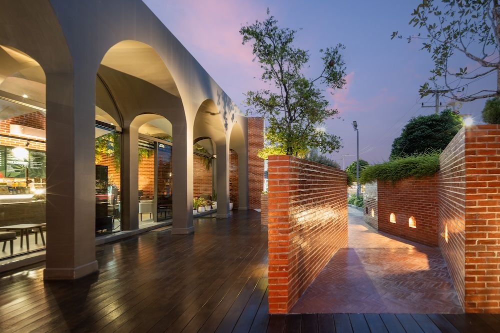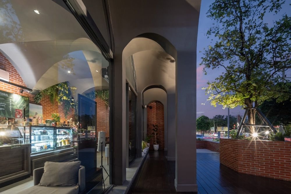 Café Amazon was elevated 0.70 meter above the ground. The entrance consisted of exposed brick stepped wall with stairs built-in. The narrow space between walls led the eyes to the archway at the end of the staircase where the café terrace located. The archway also used for the front façade of the café to integrate with the main design concept. The exposed brick wall around the restroom area was used as a divider to hide the restroom from the café and to make the spaces blending into a harmonious whole.
