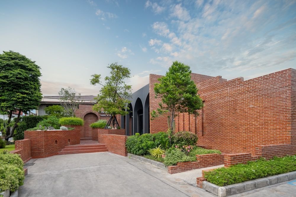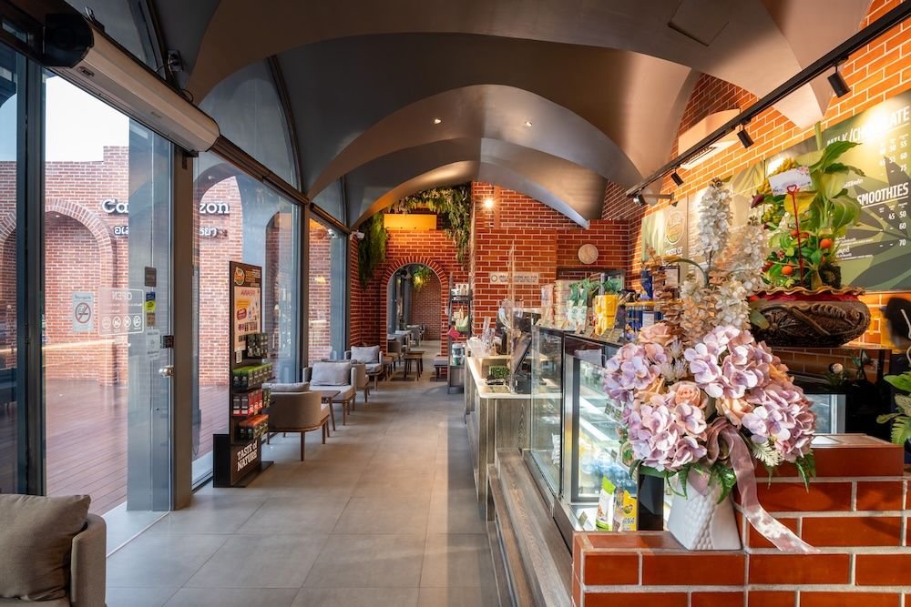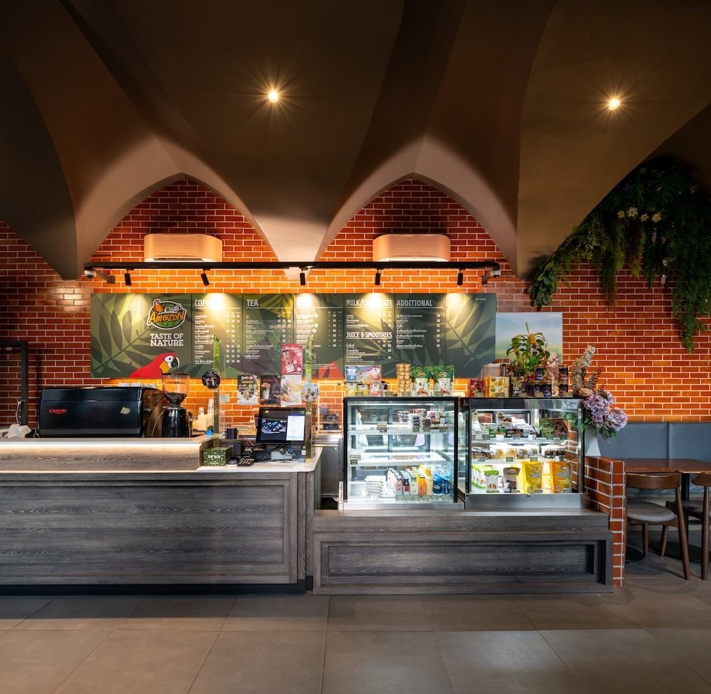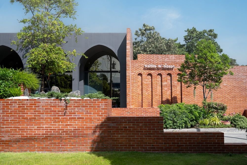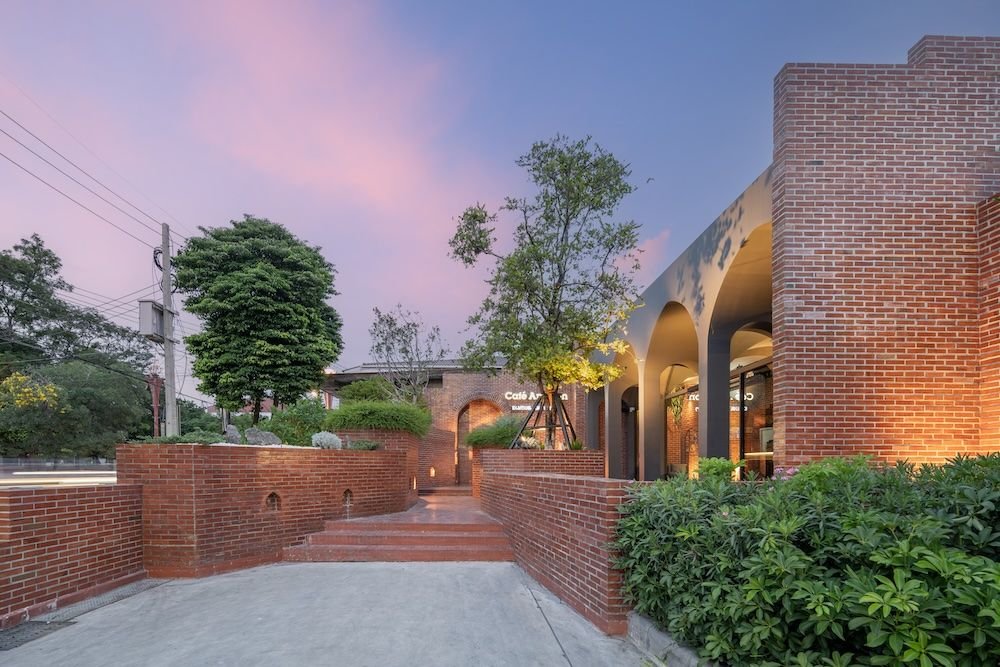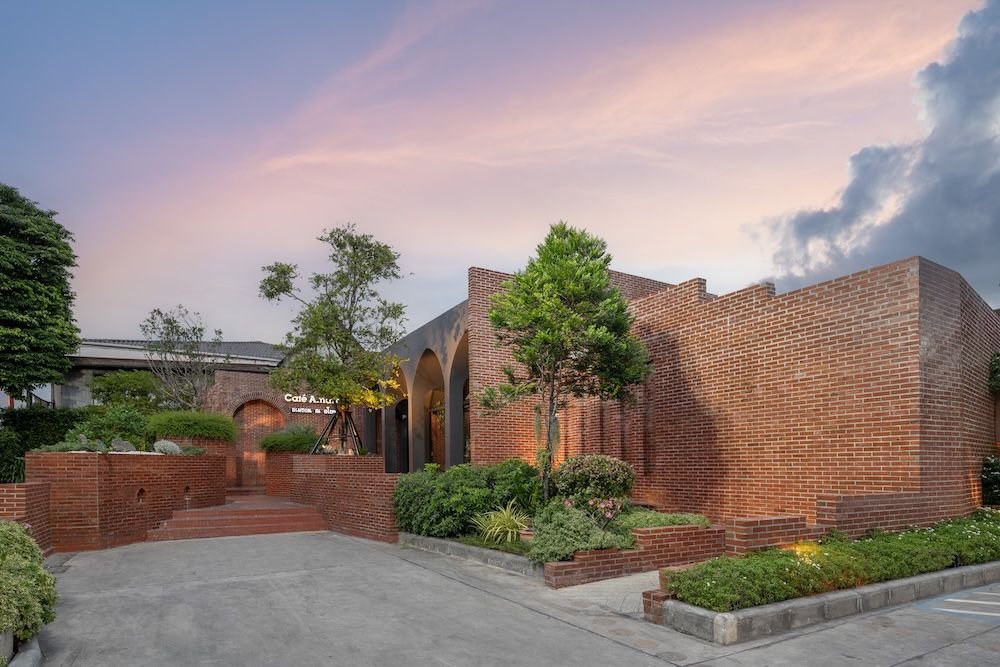 Café Amazon was elevated 0.70 meter above the ground. The entrance consisted of exposed brick stepped wall with stairs built-in. The narrow space between walls led the eyes to the archway at the end of the staircase where the café terrace located. The archway also used for the front façade of the café to integrate with the main design concept. The exposed brick wall around the restroom area was used as a divider to hide the restroom from the café and to make the spaces blending into a harmonious whole.