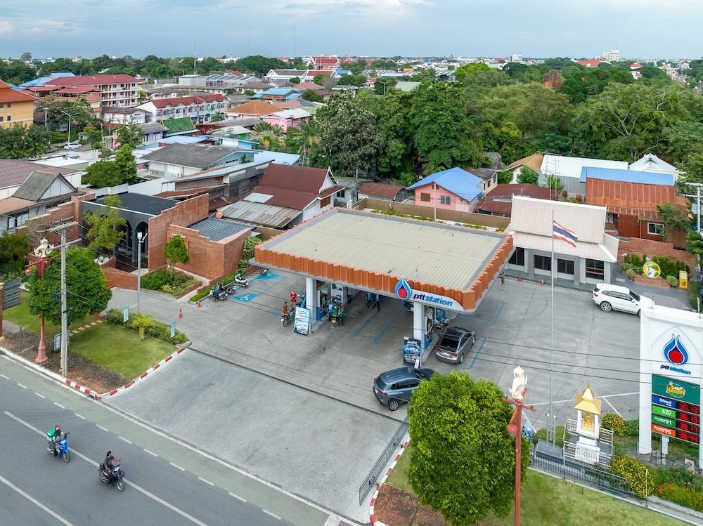 The design of petrol filling station adapted the recess design of historical architecture with new materials. For example, folded aluminum claddings were used for the roof façade in replication of a recessed pagoda and used for roof posts to reduce the scale and to mimic a post in the ordination hall of a temple. The recess design was also used for the ceiling lights and logo of PTT for a highway sign.