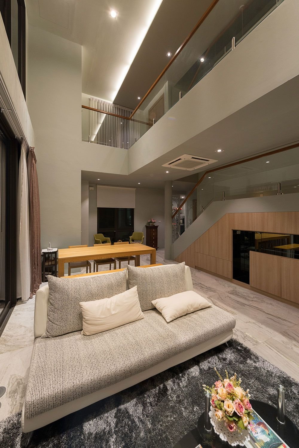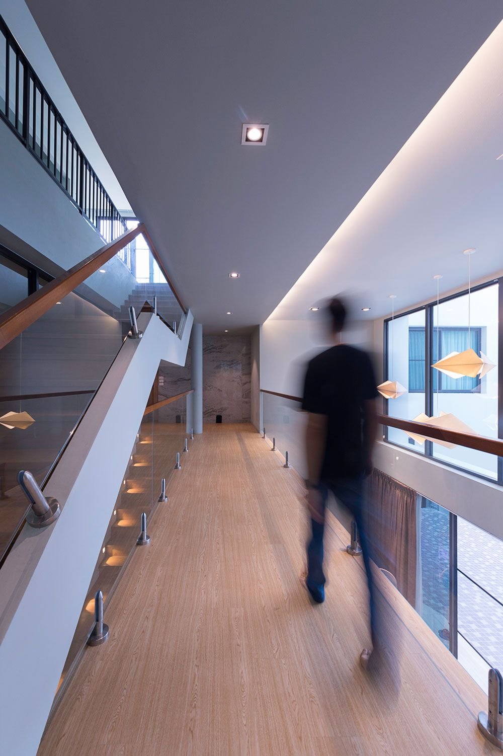 To bring natural light and good ventilation, the house is designed into a U-shaped building with a small central court that continues into the house, which creates a good atmosphere for living and dining areas. This space is two-storey height. There is a staircase from first to third floor and the open void from the second floor hallway to the living room on the ground floor that creates an open space that overlooking into the garden outside the house. This space allows air to flow into the house and bring natural light.