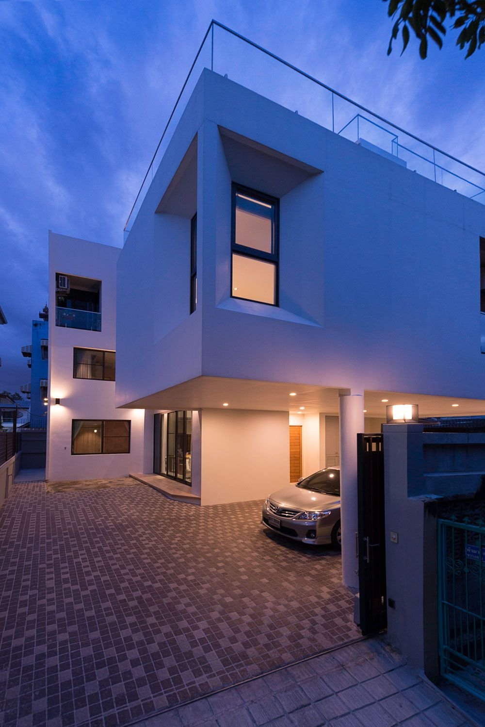 The design of the building starts with rectangular boxes, deducted into a U-shaped with a central court that connect between the outside and inside spaces. The projected mass of building on the 2nd and 3rd floors provides a parking space for the ground floor and views for the 3rd floor.